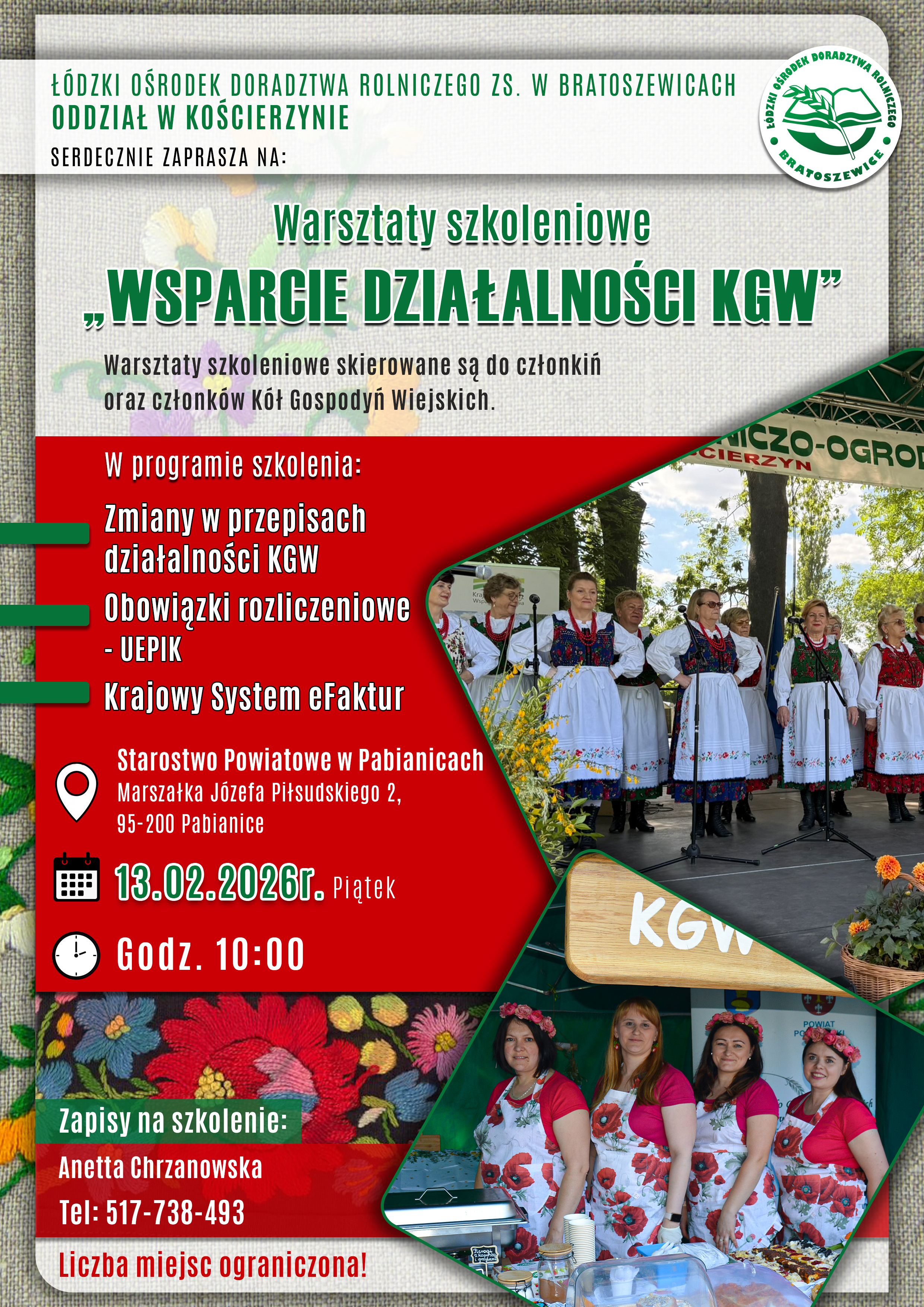 Łódzki Ośrodek Doradztwa Rolniczego ZS. w Bratoszewicach Oddział w Kościerzynie serdecznie zaprasza na Warsztaty szkoleniowe "Wsparcie działalności KGW" skierowane do członkiń oraz członków Kół Gospodyń Wiejskich.