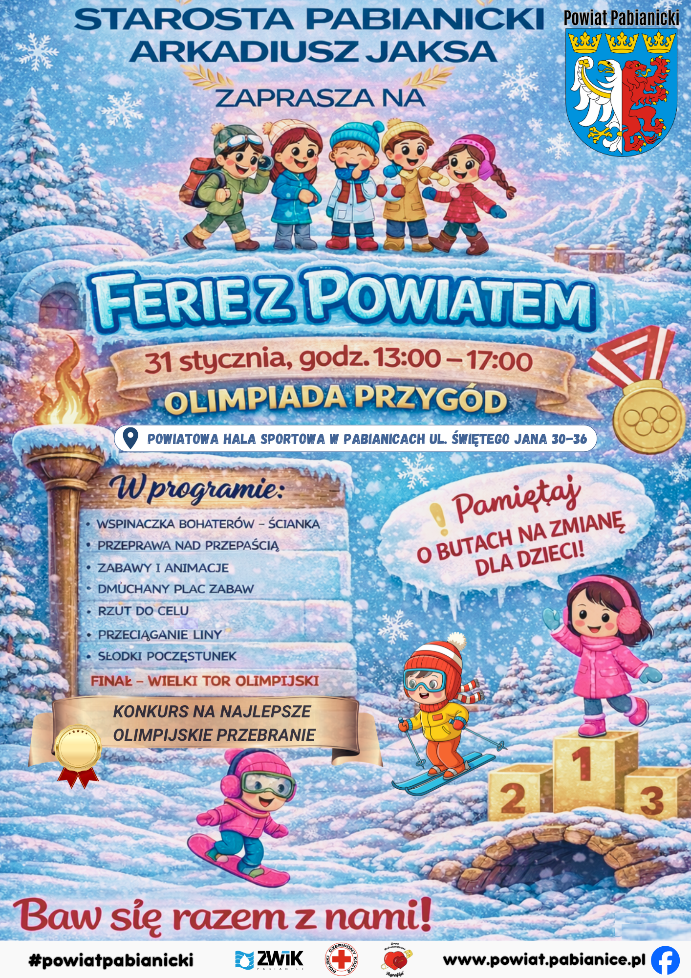 Starosta Pabianicki Arkadiusz Jaksa zaprasza dzieci i młodzież na niezapomniane „Ferie z Powiatem”, które w tym roku odbędą się pod hasłem Olimpiady Przygód. To doskonała propozycja na aktywne, pełne radości i sportowych emocji spędzenie ferii zimowych.